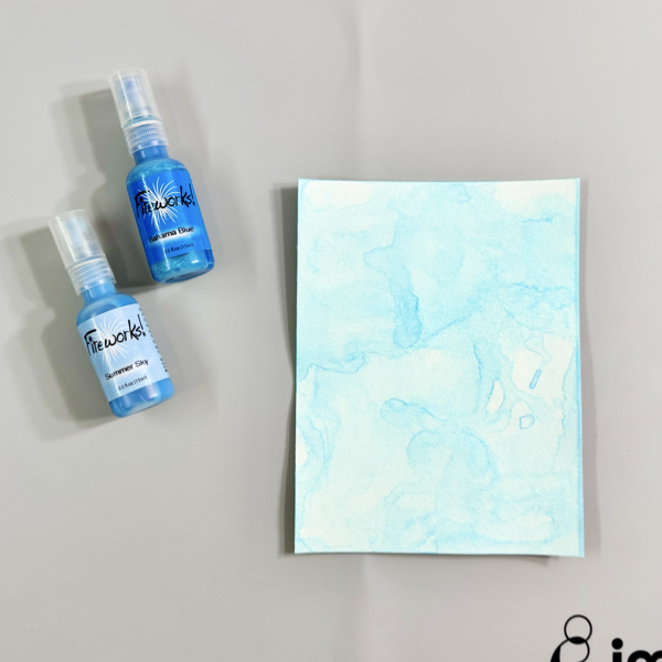 Spray the Fireworks! Summer Sky and Bahama Blue on the craft mat, and lightly spray with water to create the watercolor ink blends on the craft mat.