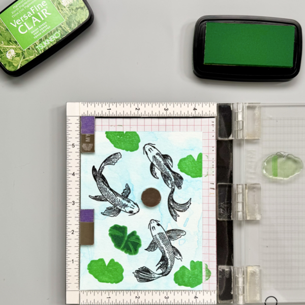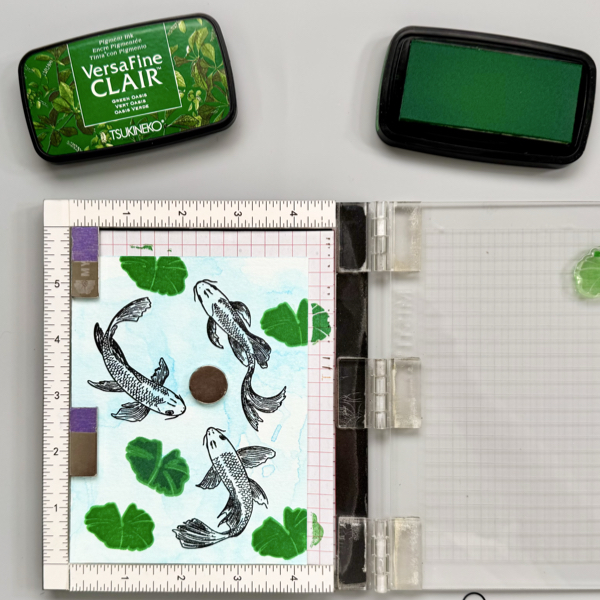 Next is to stamp the second layer of the lily pad leaf. Position the stamp on top of the first stamped image and then stamp it with the VersaFine Clair Green Oasis ink pad.
