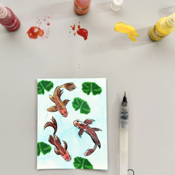 Pick up the ink color and start watercoloring the koi fishes. Each color will blend well.
