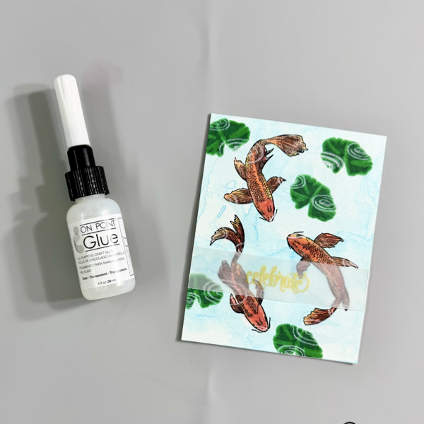 Add the sentiment vellum strip on the background panel and fold the extra flap to the behind of the panel and secure it with some of the On Point Glue.
