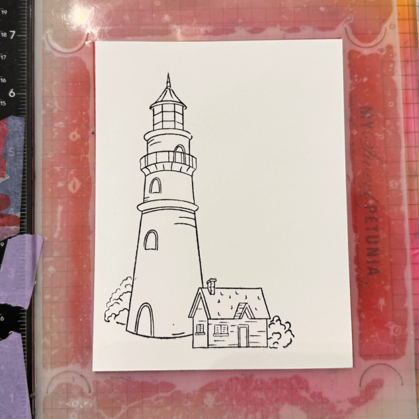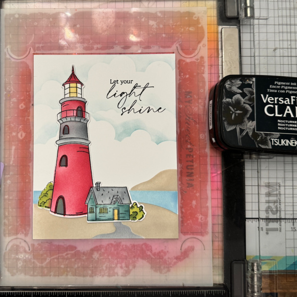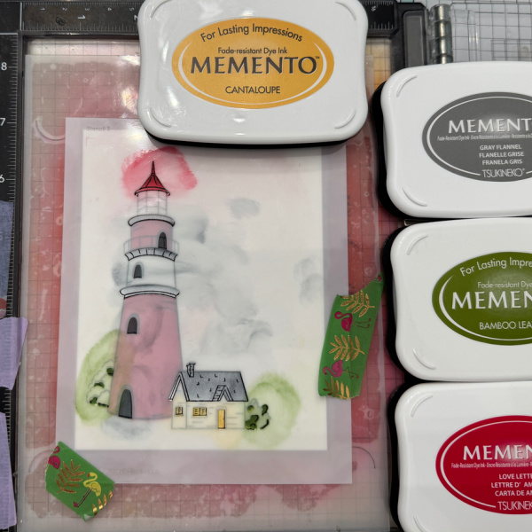 Using the first stencil color the portion of the lighthouse and bush. I used Love Letter and Pear tart Memento ink.