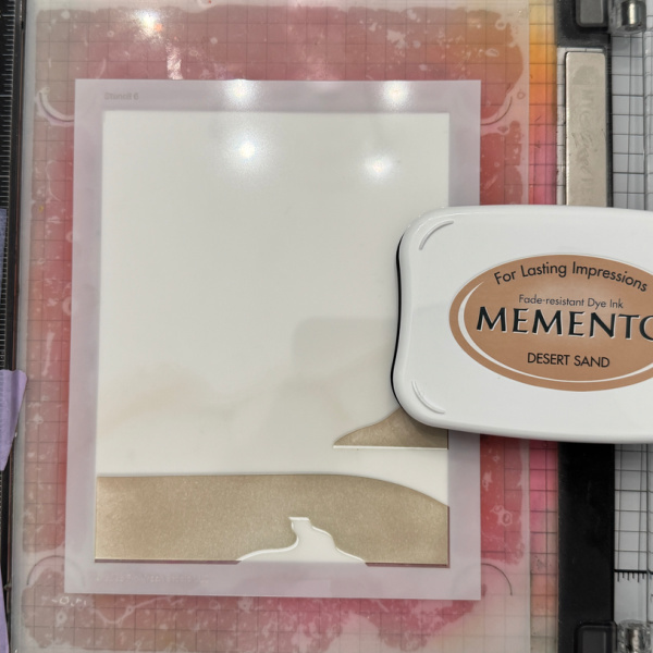 Color the open portion of the fourth stencil creating the sand. I used Desert Sand. For the walkway/path I used Gray Flannel.