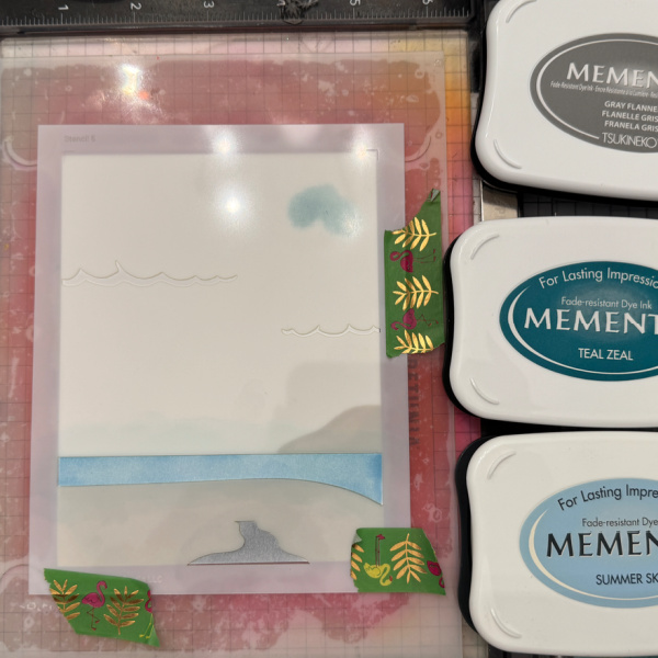 Color the open portion of the stencil creating the water. I used a mixture of Summer Sky and Teal Zeal.