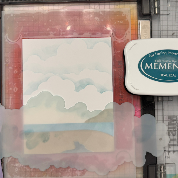 Create clouds in the background by using a cloud stencil. The ink I used is Teal Zeal.