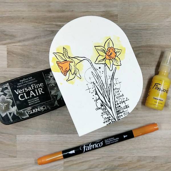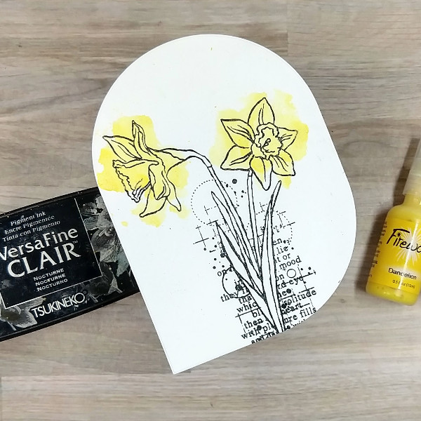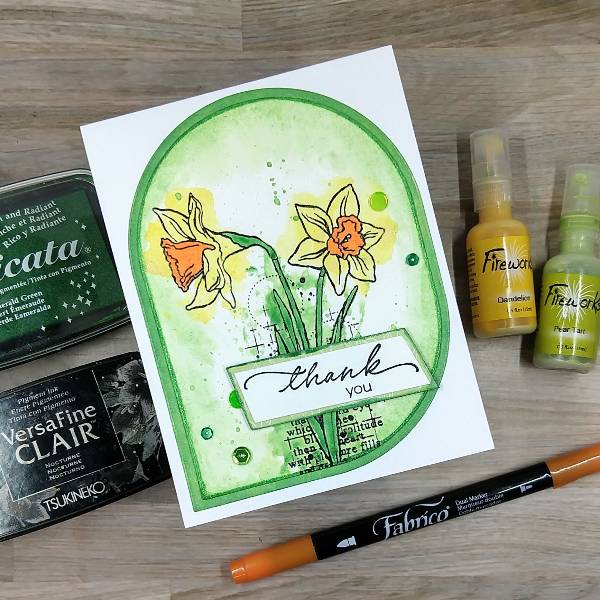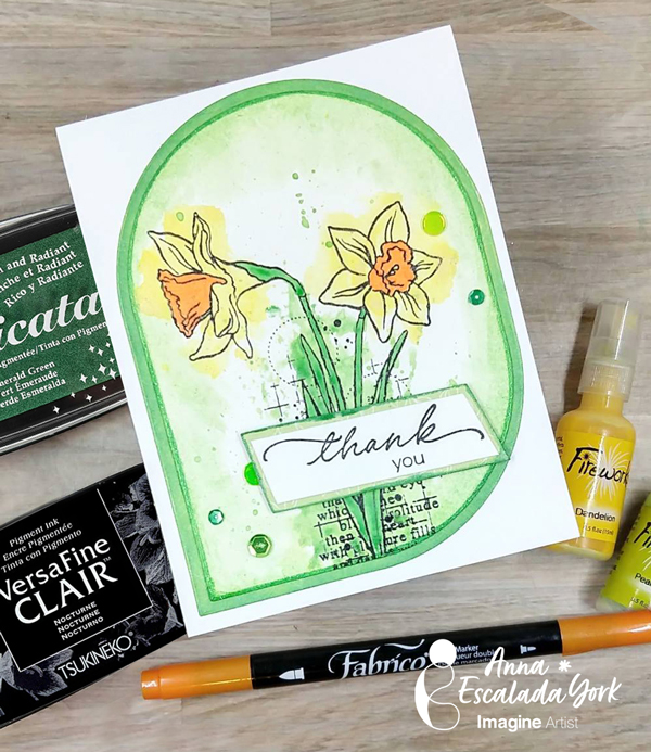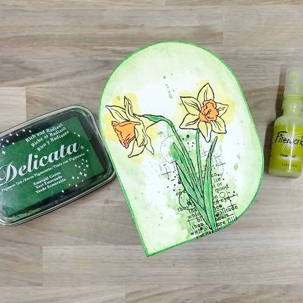 Press the Emerald Green Delicata ink pad onto acetate. Then spray Pear Tart Fireworks! Craft Spray onto the same acetate. Mix the ink and spray together. Press the acetate onto the daffodil’s stem and leaf. Then paint the leaf and stem with the remaining green mix. After the image has dried, spray the mix with water to dilute the green. Paint the sides with this lighter color green watercolor. (I ended up using my finger to spread the watercolor the way I wanted, but I don’t mind getting messy!) After this layer dried, press the Emerald Green Delicata ink pad onto the edge of the die cut. Heat emboss the inked edge with more clear embossing powder.