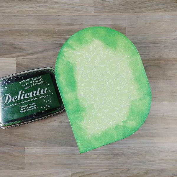 Die cut light green patterned paper with the next-largest die from the background panel die cut set. Brush the Emerald Green Delicata ink around the edges of the panel to mask the pattern and make the green more intense.