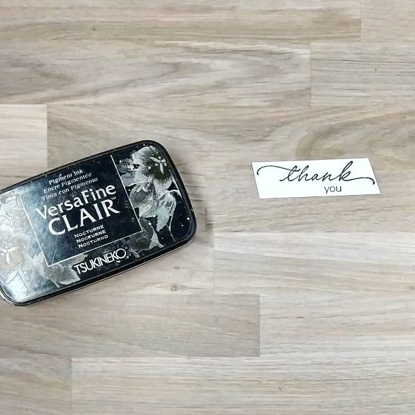 Stamp the sentiment with Nocturne VersaFine CLair ink and heat emboss with clear embossing powder. Then trim the sentiment with a paper trimmer.