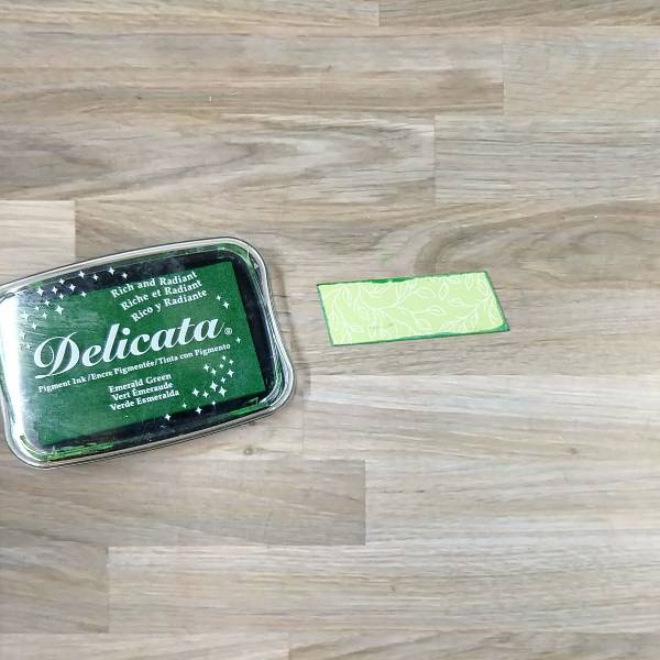 Trim a piece of the same light green patterned paper a little bit bigger than the sentiment strip with the paper trimmer. Press the edges into the Emerald Green Delicata ink pad and heat emboss with clear embossing powder.