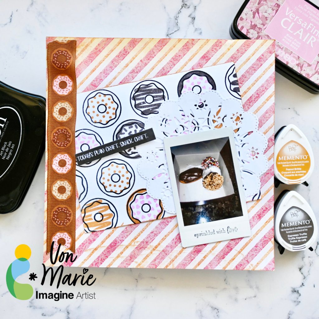 Hello everyone. Von Marie here and I have my newest video sharing an easy and fun Donuts Mini Layout Page perfect for hanging in your craft room. I love donuts and this page is so much fun to create using Memento inks. You can make any kind of page perfect to hang in your craft room. The video will have more details.
