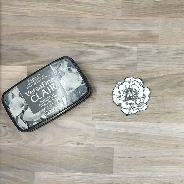 Stamp a mid-sized flower with Morning Mist VersaFine Clair ink. Heat emboss with clear embossing powder. Fussy cut the flower and then press the edges along the edges of the flower with more of the Morning Mist VersaFine Clair ink to disguise any imperfections left behind when fussy cutting and heat emboss a second time with clear embossing powder.