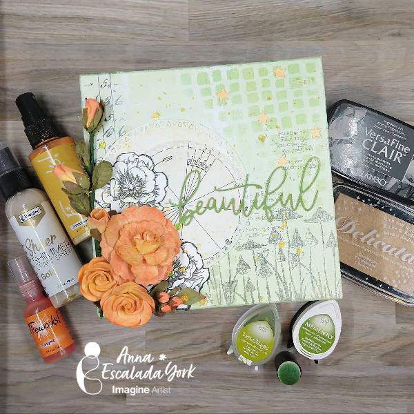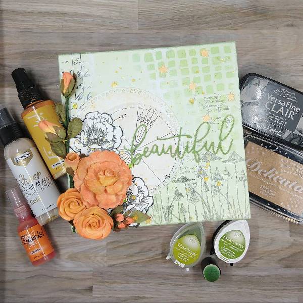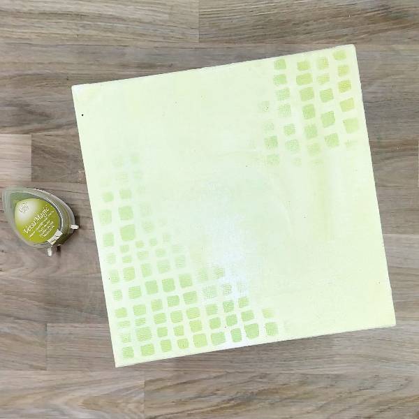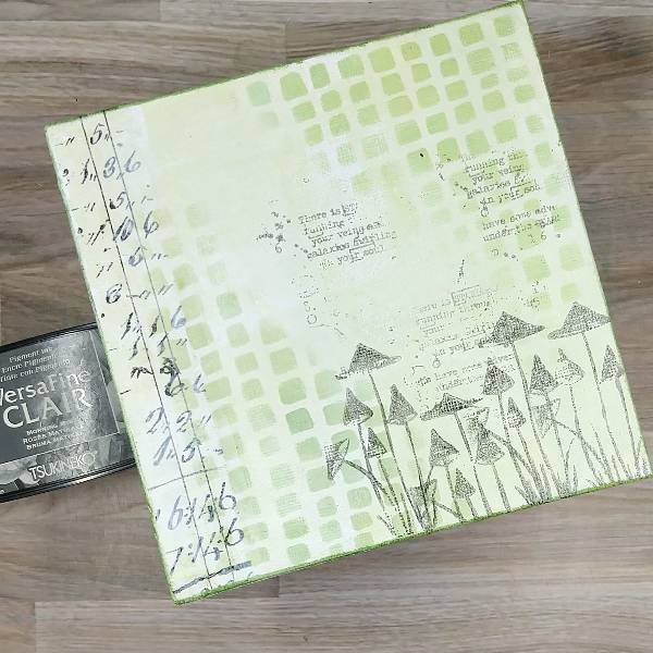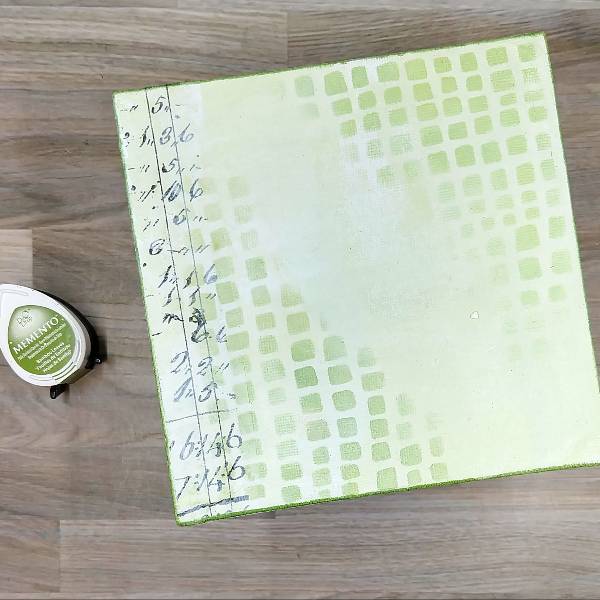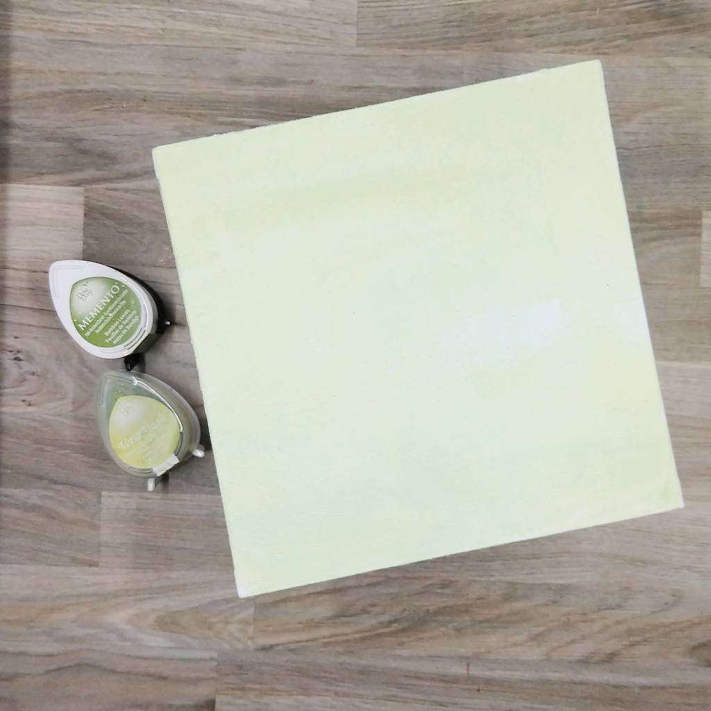 Paint gesso onto a 6×6” canvas panel and let dry. Then mix a small amount of gesso with Tea Leaves VersaMagic chalk ink on a palette (or a piece of plastic packaging) to create a very light green tin. Repeat the process with more gesso and Bamboo Leaves Memento ink to create a slightly darker green tint of gesso. Using a wide paintbrush, brush both the lighter and the darker green gesso across the panel randomly. Allow to dry a second time. (Or if you are feeling impatient, dry with a heat tool.)
