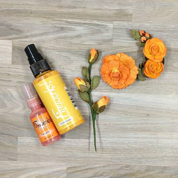 Using a smaller paintbrush, paint the entire surface of each paper flower’s petals with Cantaloupe Fireworks! Shimmery Craft Spray and then paint the edges with Tangelo Fireworks! Shimmery Craft Spray. Allow to dry.