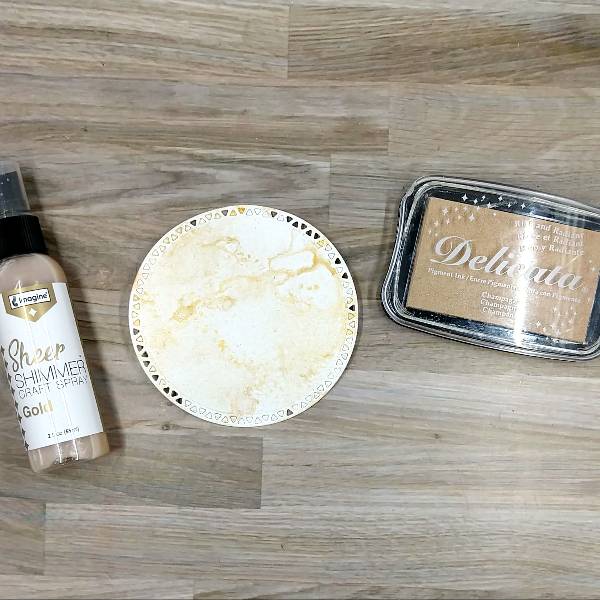 Press the Campagne Delicata ink pad onto watercolor paper. When dry, die cut the watercolor paper with a large circle in a nesting circle die set. Then spray with Gold Sheer Shimmer Craft Spray and allow to dry.