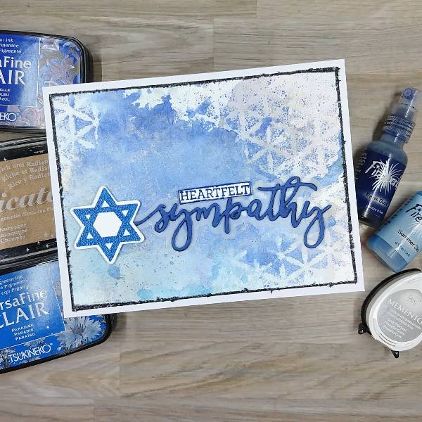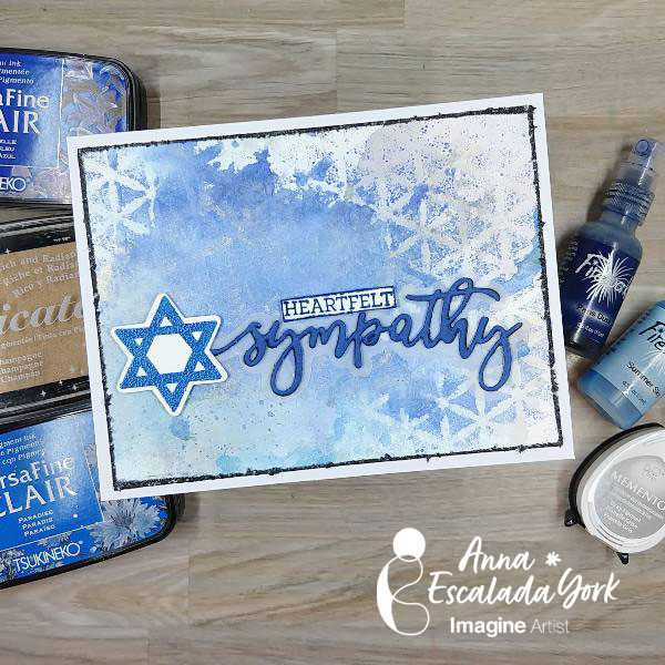 Stamp stars on watercolor paper with Paradise VersaFine Clair ink. Repeat the process so make the blue of the ink darker. Then heat emboss with clear embossing powder. Then die cut with the corresponding die.