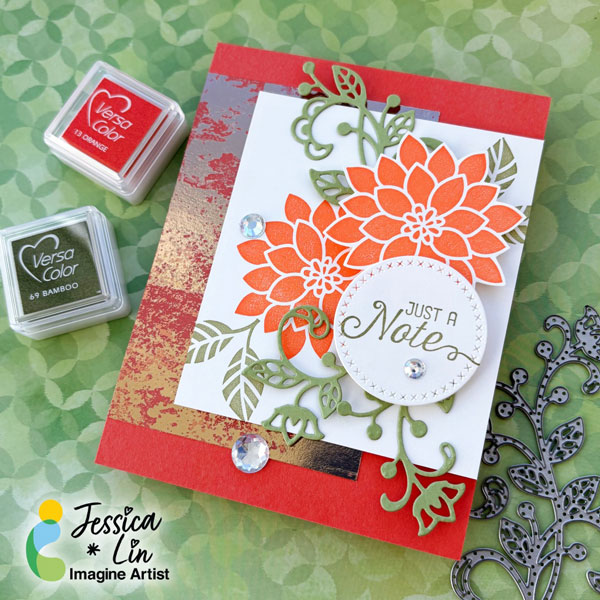 Hi everyone! It’s Jessica here. I am so happy to be on Imagine Crafts’ design team again for 2026. If you have seen some of my creations before, you would notice that I love bold, bright colors. Today, I am sharing a floral card that features this vibrant orange from the VersaColor ink line.