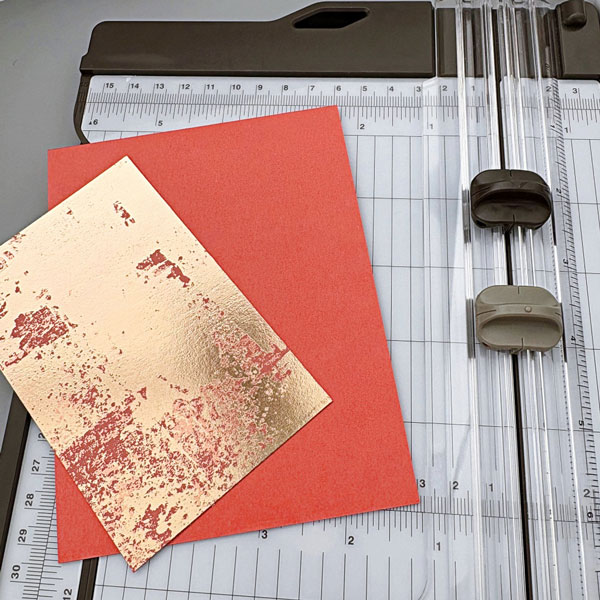 I started out by preparing an A2 card base with Calypso Coral cardstock. Then I trimmed a piece of Dry Brushed Metallic paper to 3’’ x 4.5’’ as a background accent.