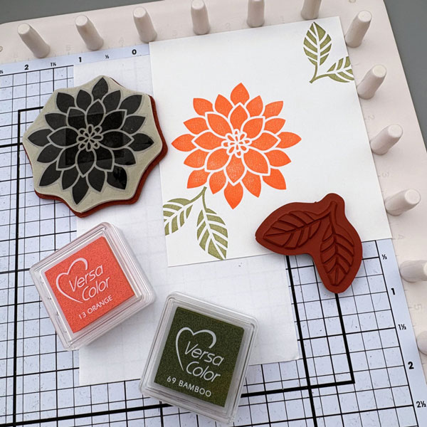 The stamp set I am using today is Flourishing Phrases from Stampin’ Up. I stamped the flower image with VersaColor Orange ink pad on a piece of 3.5’’ x 4’’ cardstock. For the leaves, I used VersaColor Bamboo ink pad.