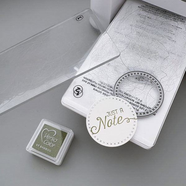 Then I die cut a circle with cross-stitch details and stamped the sentiment with VersaColor Bamboo ink.