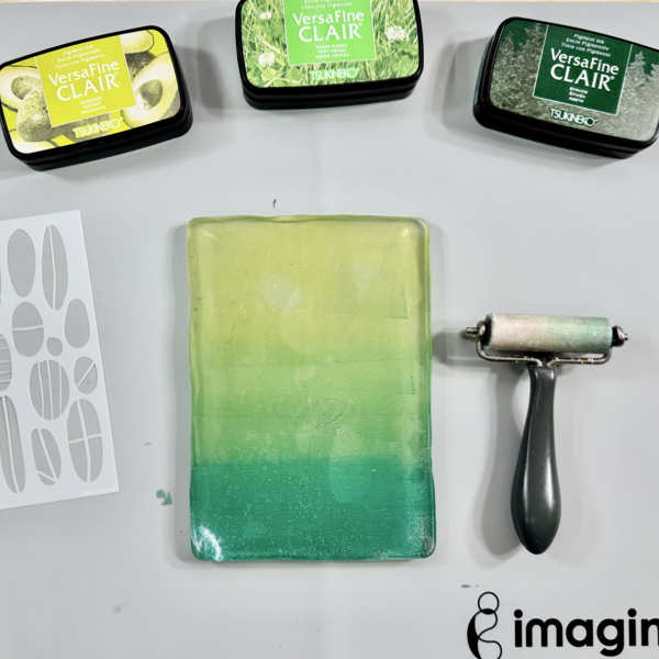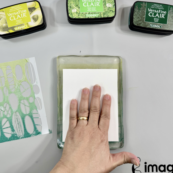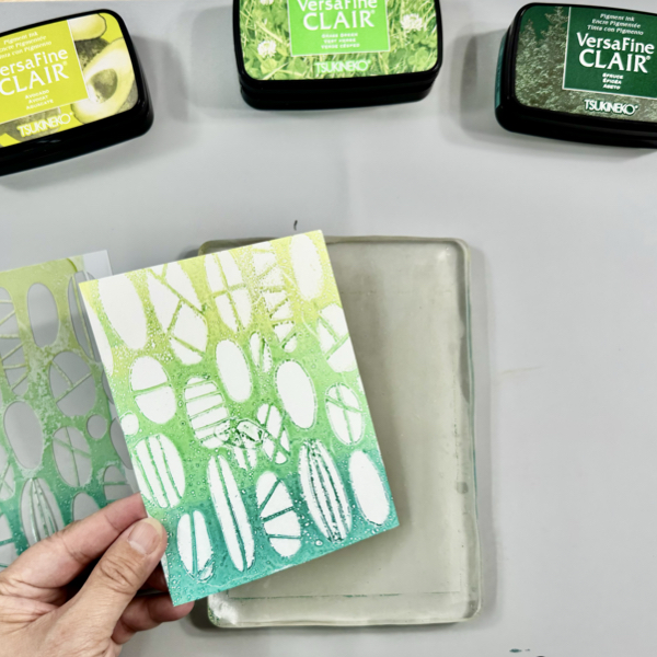 While the inks are still wet (this is why VersaFine Clair inks are the best for this project!), put a piece of white cardstock to the gelli printing plate and gently press down to pick up the ink off the plate.