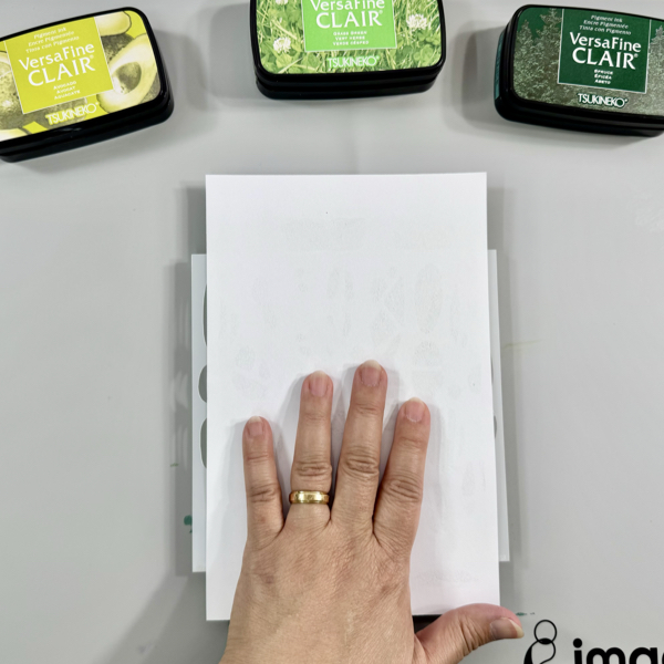 Arrange the flower stamps on it and stamp them with the VersaFine Clair Nocturne ink pad.