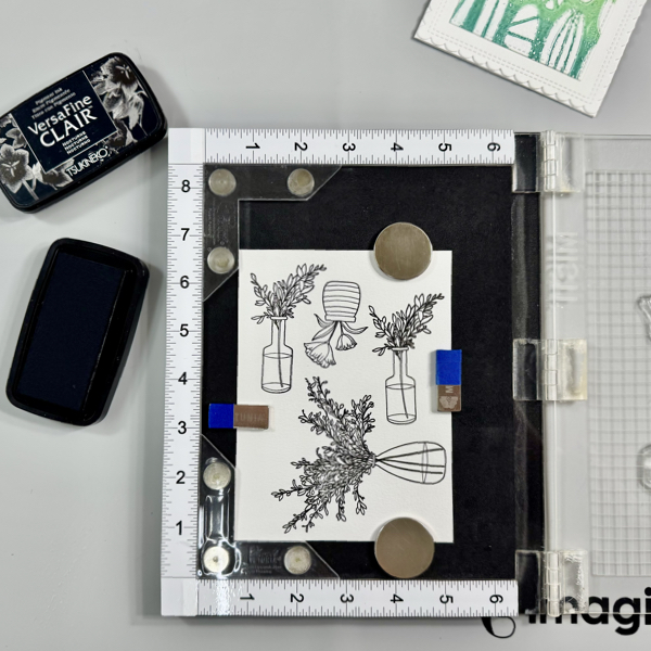 Put a piece of white cardstock on a stamping platform and secure it with some magnets.