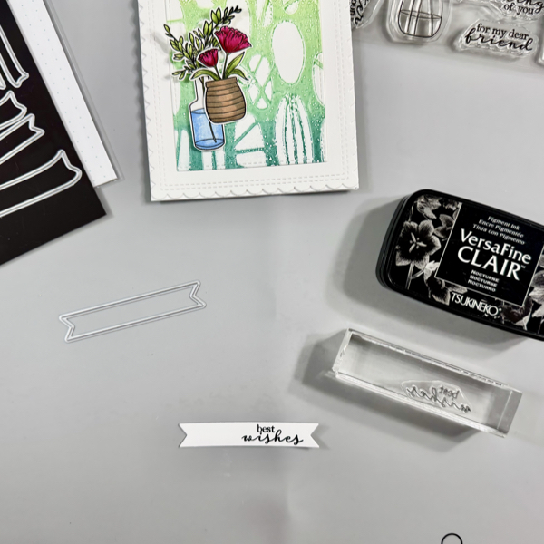 Using On Point Glue, add a piece of thin foam to the back of the sentiment banner and add it to the card with the same glue.