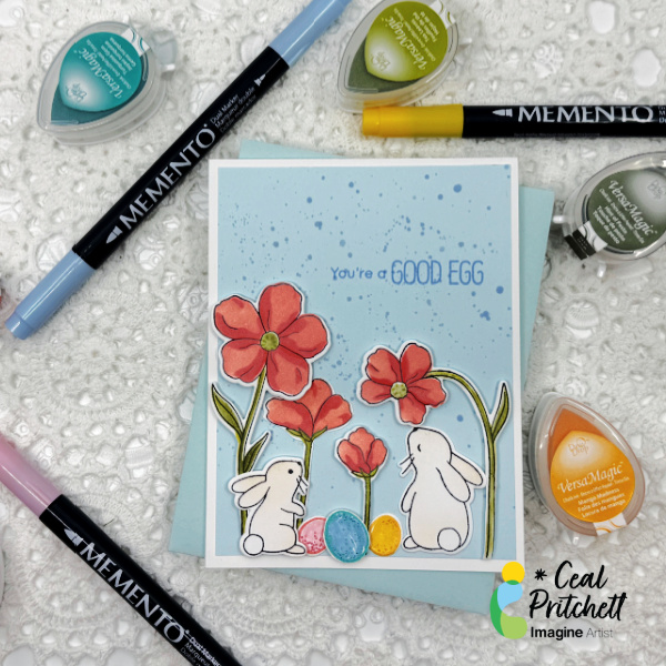 It’s Ceal, here. Today I am sharing how to make this cute Easter card. I love the elements to this card; the flowers are gorgeous, and the bunnies are super cute. You could leave off the eggs and easter sentiment and it becomes a spring card.