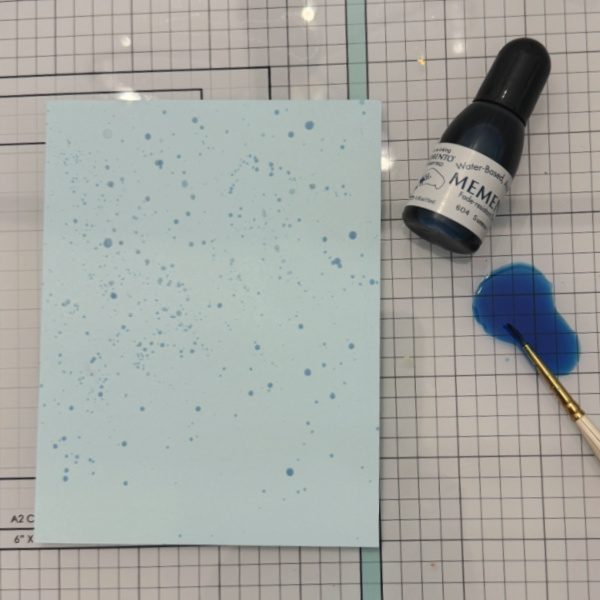 Cut a panel of light blue cardstock 5.25 x 4. Using a paint brush and a re-inker splatter the panel with a light blue ink. I used Memento Summer Sky.