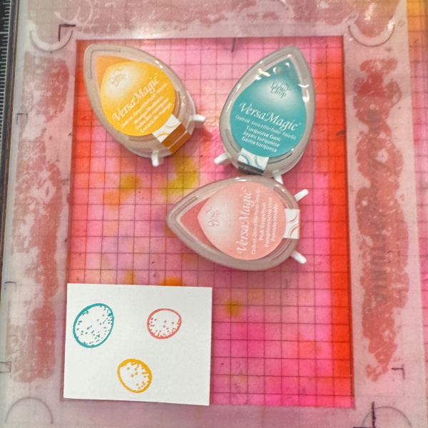 Stamp the eggs in colored inks. I used  VersaMagic Mango Madness, Turquoise Gem and Pink Grapefruit.
