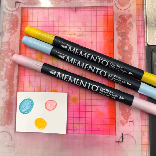 Color in the eggs with markers. I used Memento markers in Dandelion, Summer Sky and Angel Pink