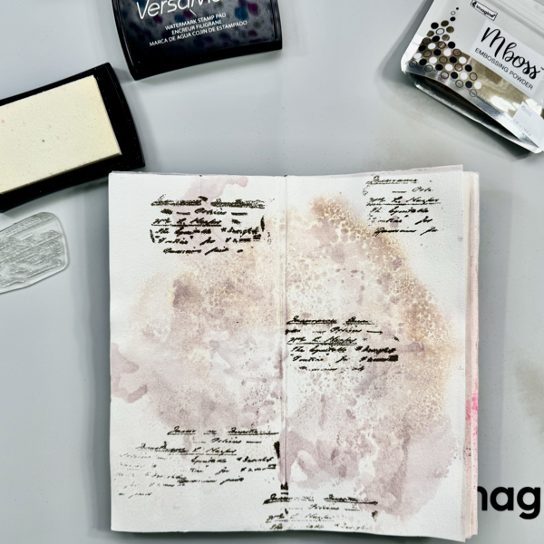 Stamp the script stamp on the page randomly with VersaMark ink and then add some of the Gold Mboss Embossing Powder to the page. Heat set the embossing powder with a craft heat gun.