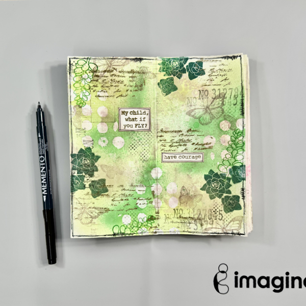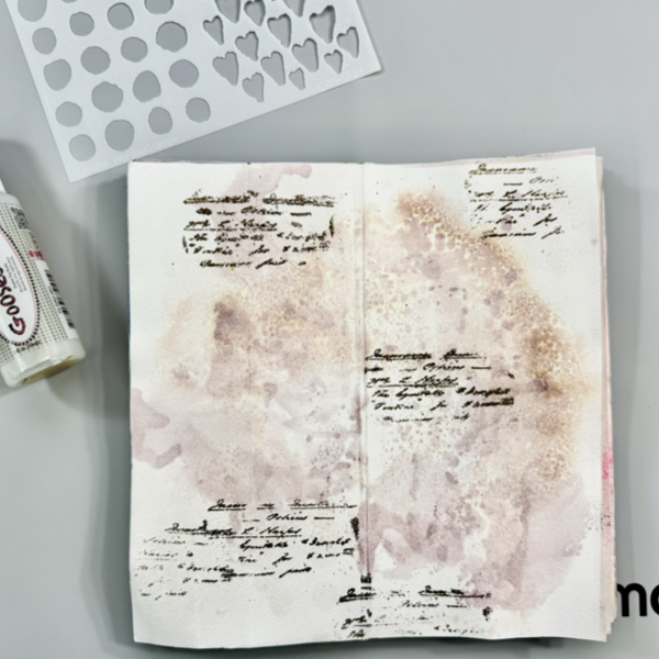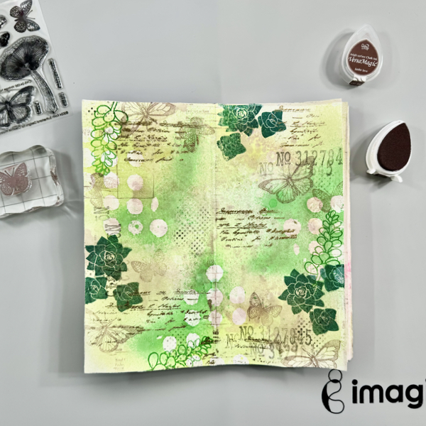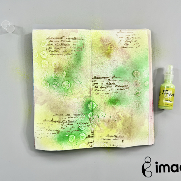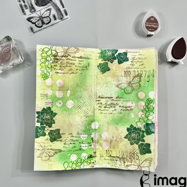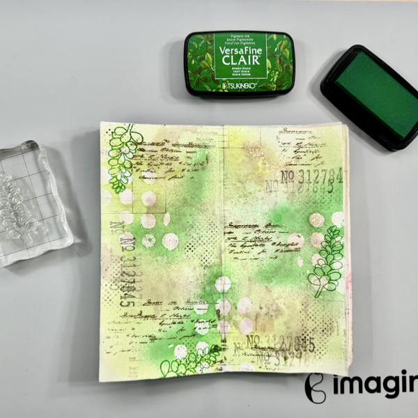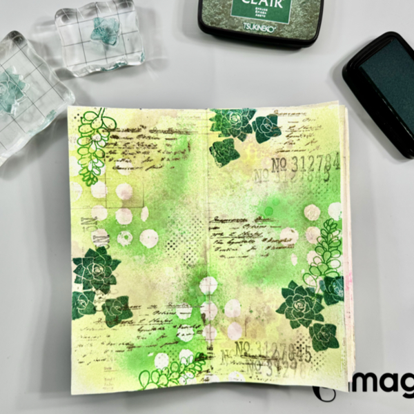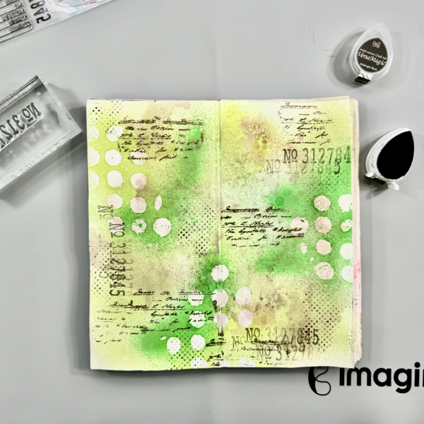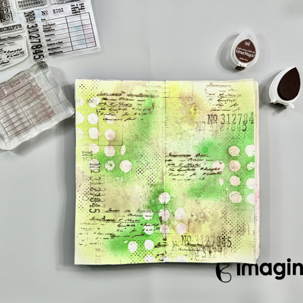 Stamp the numbers texture stamp randomly on the page with VersaMagic Midnight Black ink using first and second generation stamping technique.