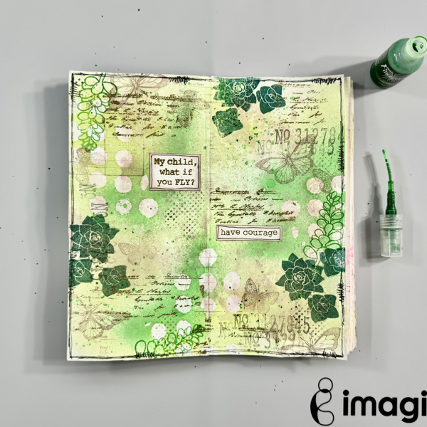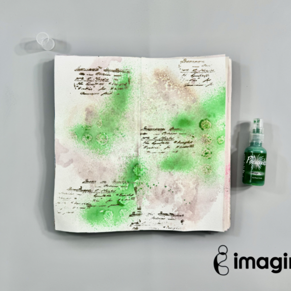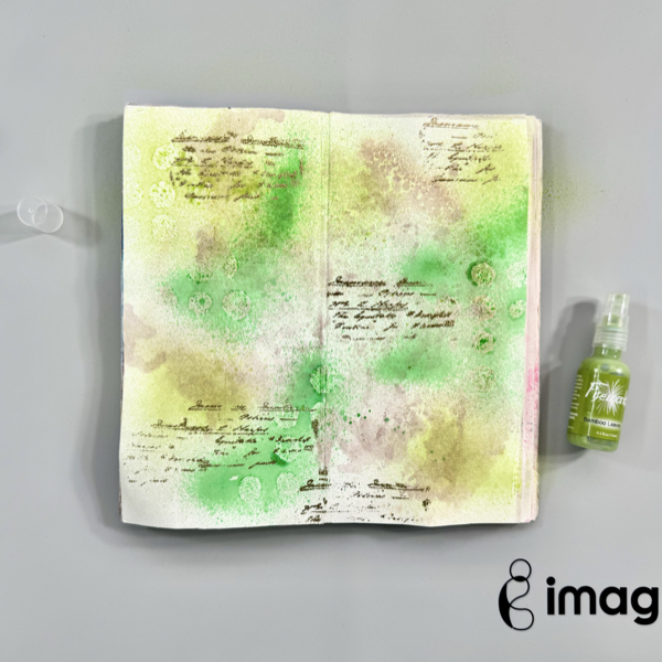 Smoosh the page (or paper) to the ink and dry it with a craft heat gun. Repeat this step to create the watercolor background.