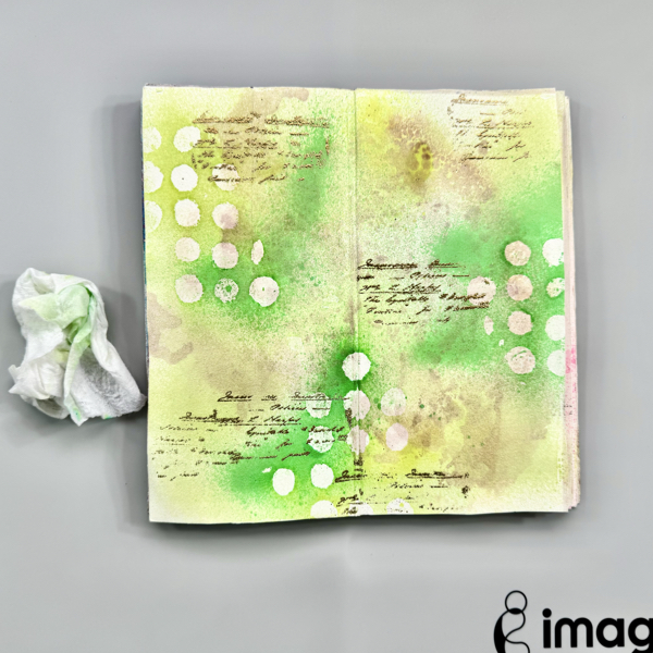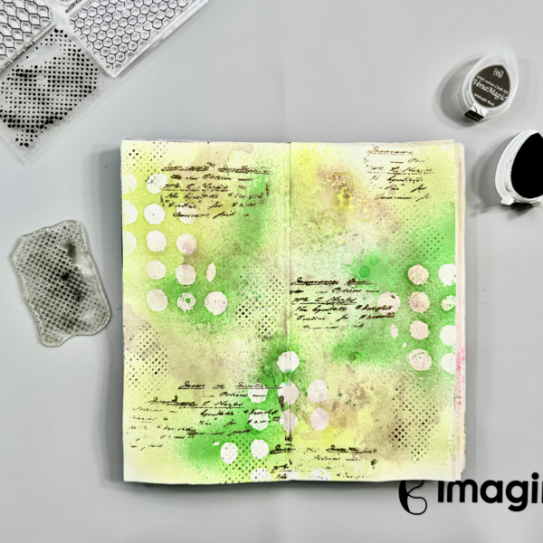 Stamp the dots texture stamp randomly on the page with VersaMagic Midnight Black ink using first generation stamping technique.