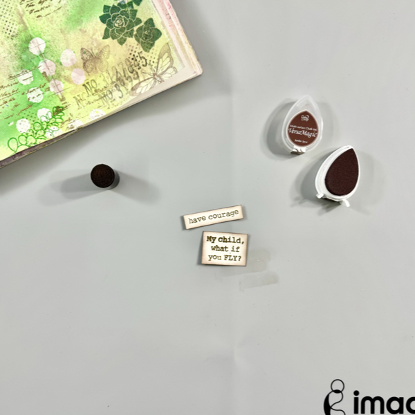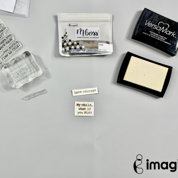 On a white cardstock, stamp the sentiments with VersaMark Ink and then add some of the Gold Mboss Embossing Powder. Heat them with a craft heat gun.