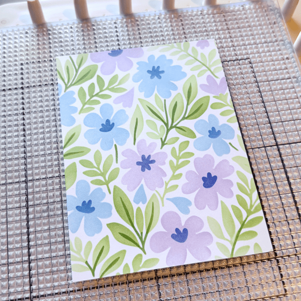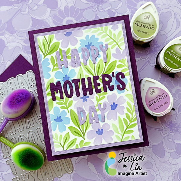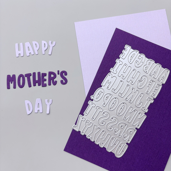 After ink blending, we are ready to add the sentiment of the card. I chose Stampin’ Up’s Mini Alphabet die to spell out “Happy Mother’s Day”, but you could use any sentiment die you may have. I decided to die cut with CutCardStock DCS Hydrangea Purple and Plum Purple for some added contrast. These cardstock have a smooth side and a textured side; I opted for the textured side today.