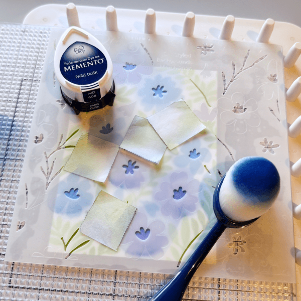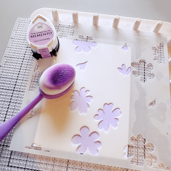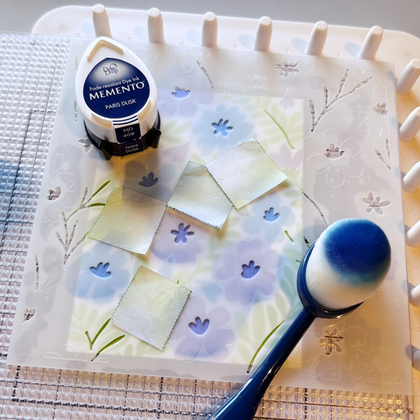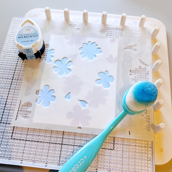 Next, ink blend Memento Summer Sky ink with stencil 2. I really like the idea of separating the floral images into two layers; it gives us so much creative freedom and the color combination is endless!
