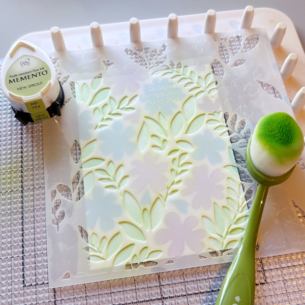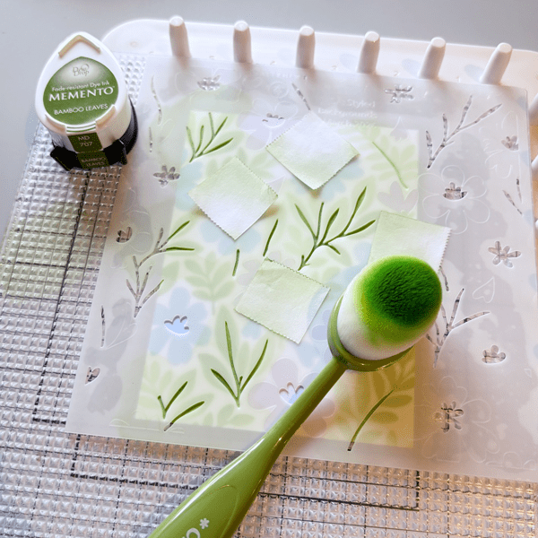 Stencil 3 is the base layer for leaves. I used Memento New Sprout ink. It may be difficult to spot in this photo, but I created a color gradient by blending more ink in some areas and having a lighter hand for others.