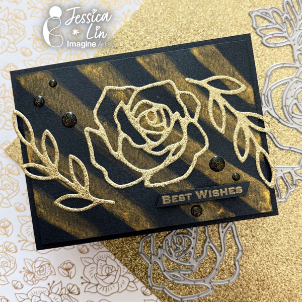– Hi everyone! It’s Jessica here. Today I would like to share a card with a black and gold color combo. My card creations are typically full of bright colors; so I decided to change it up a bit by using a simpler color palette. Since there are only two colors on this card, I wanted to add various shimmer and glitter textures to create dimension. Let’s take a look!