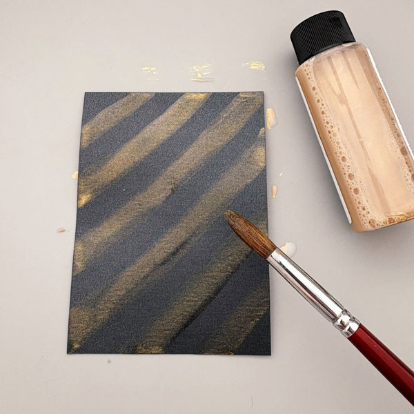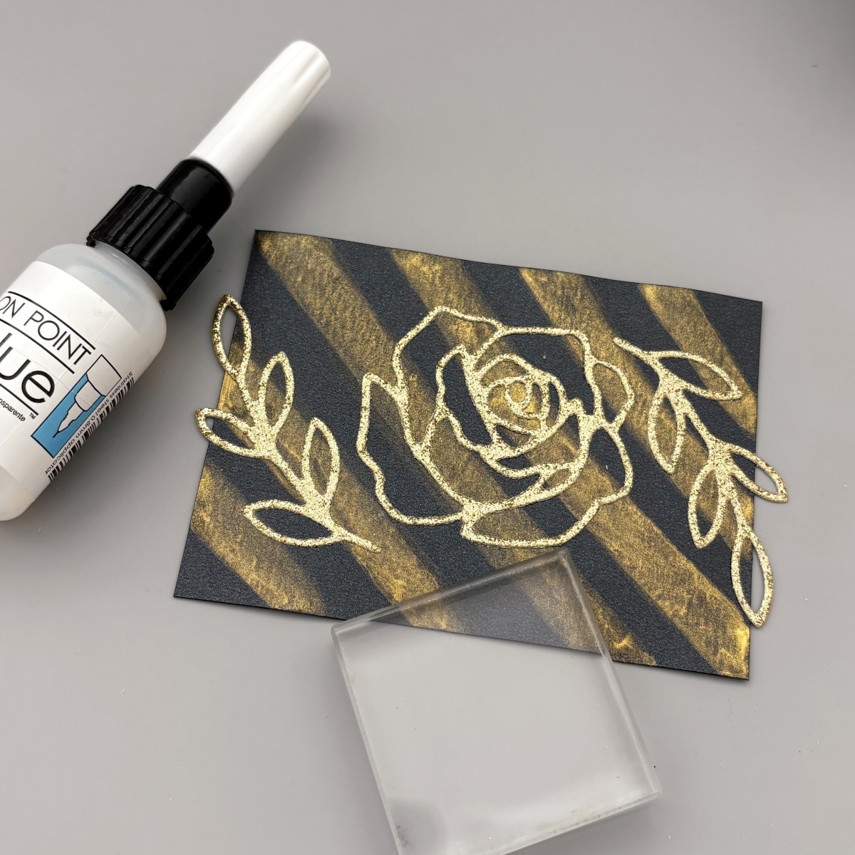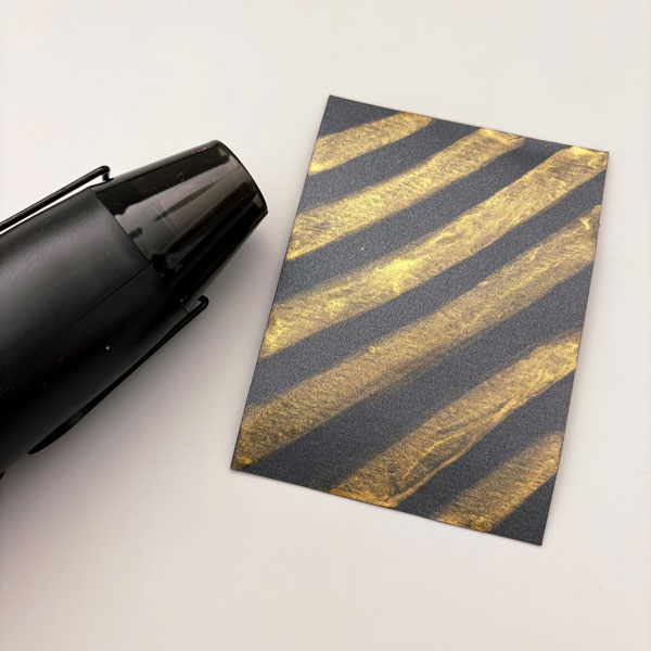 Dry the cardstock panel with a heat gun, and repeat steps 1-2 until you achieve bold, gold stripes. The Stardream Metallic Onyx cardstock has a subtle shimmer as well – it adds an elegant touch to the card base.