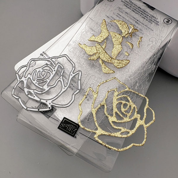 Die cut roses and leaves with DCS Gold Glitter Heavyweight 12 x 12 cardstock. I find this glitter cardstock very easy to cut through. Some of the glitter cardstock I’ve used before uses adhesives to bind to the glitter, which takes a little more time to peel the die cut pieces off each other. This glitter cardstock, on the other hand, separates very easily after it’s been cut through.
