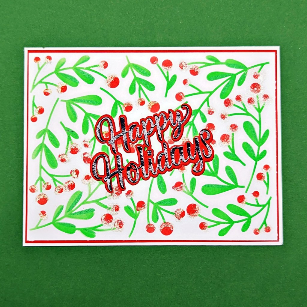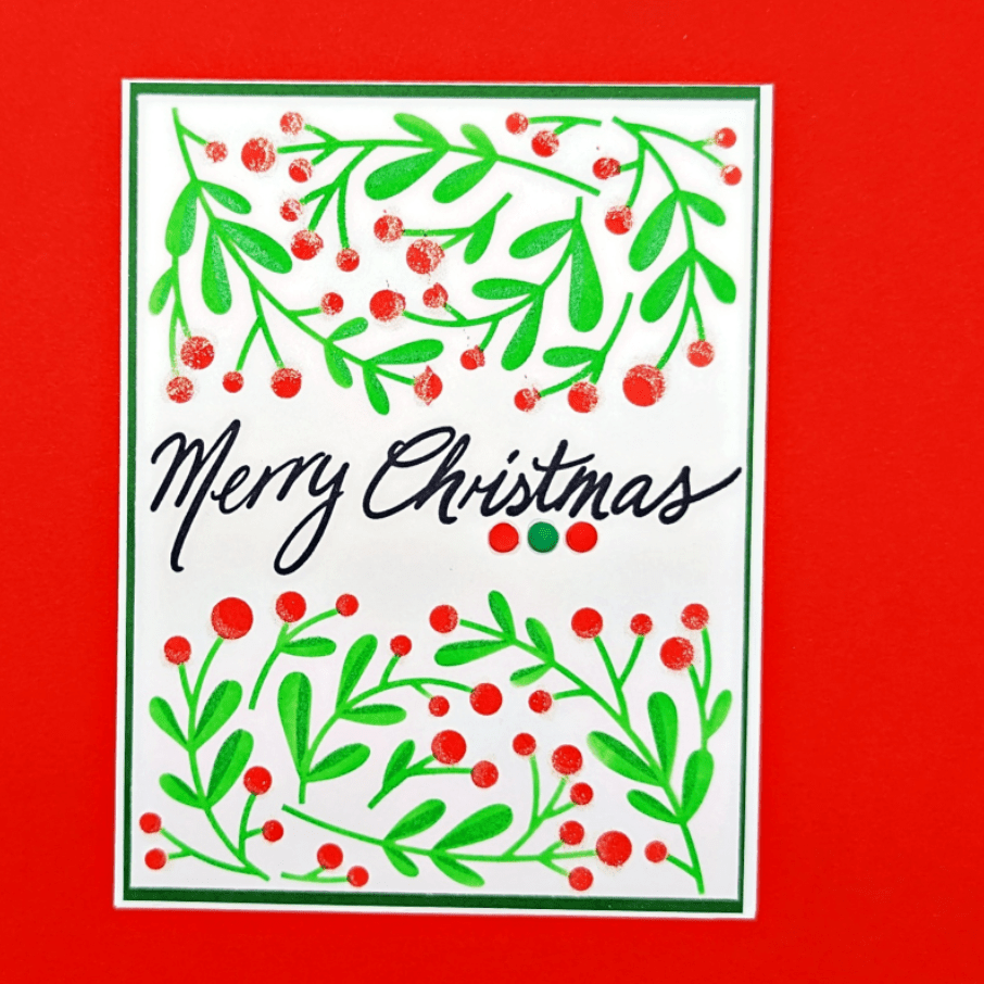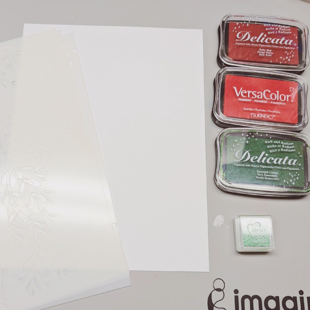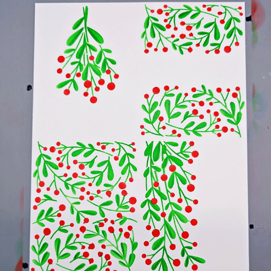 Set aside to dry and cut your card bases, I have 4 card bases measuring 4.25” x 5.5”, standard A2, I also cut green and red cardstock to use as a layering panel, they are each 4 ⅛ x 5 ⅜.