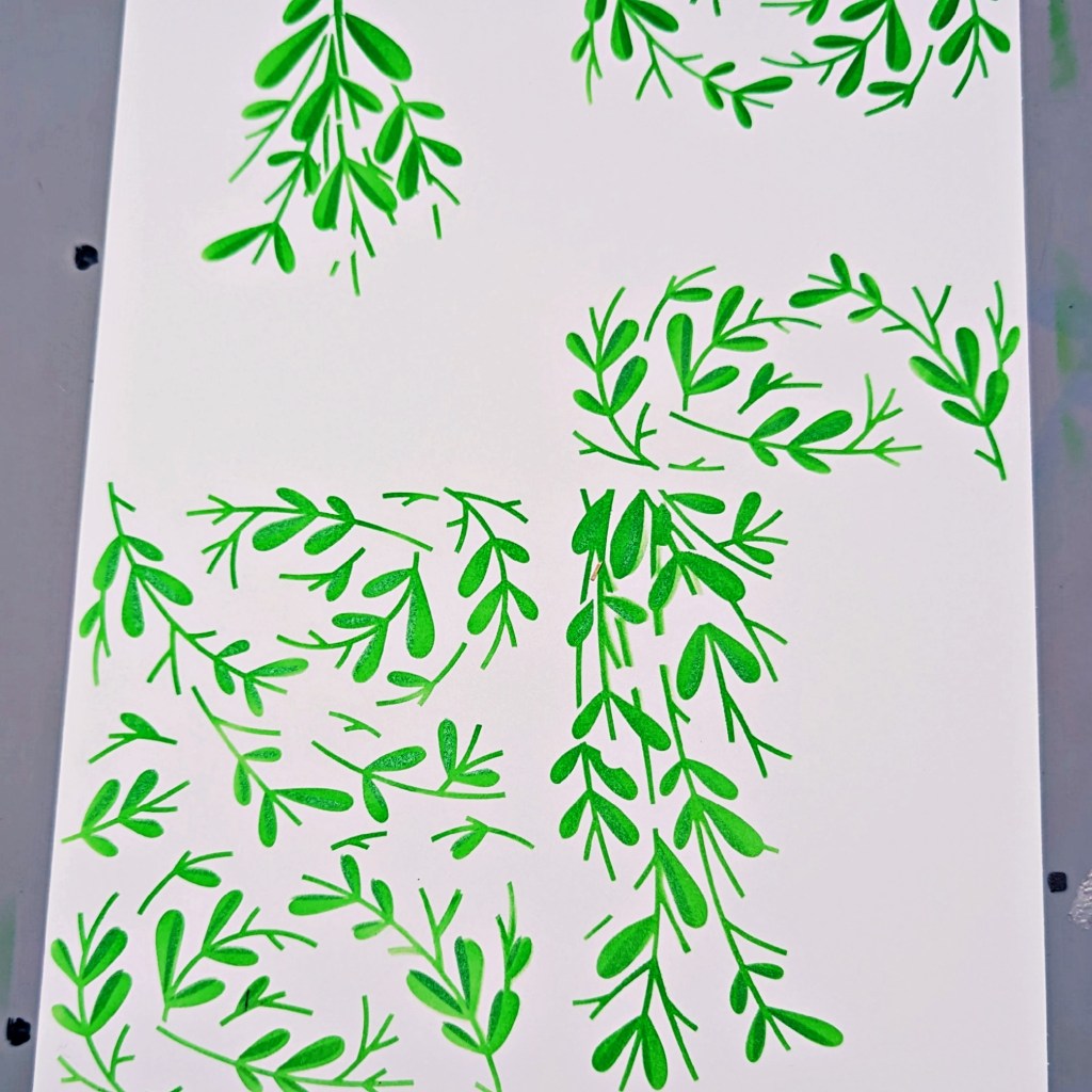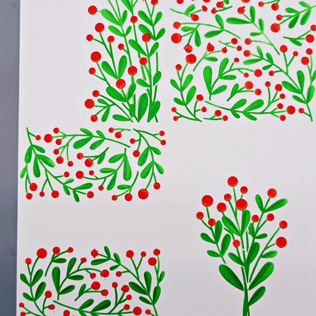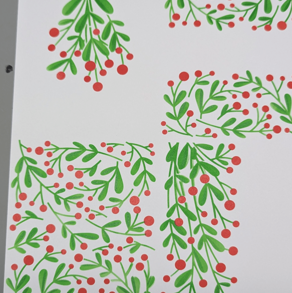 Set aside to dry and cut your card bases, I have 4 card bases measuring 4.25” x 5.5”, standard A2, I also cut green and red cardstock to use as a layering panel, they are each 4 ⅛ x 5 ⅜.