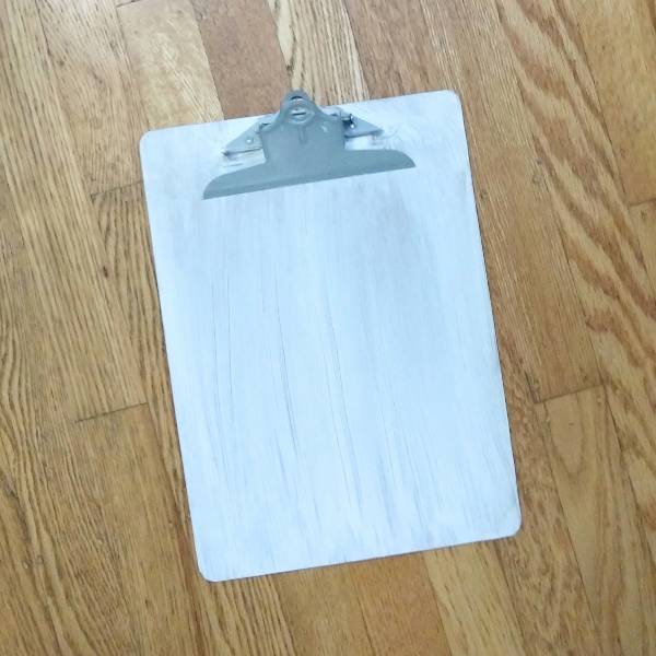 Step 1: Paint a thin layer of thin layer of white gesso onto an old clipboard and set aside to dry. (I used some old spools of washi tape to hold open the metal clip so that it wouldn’t get stuck in the drying gesso.)