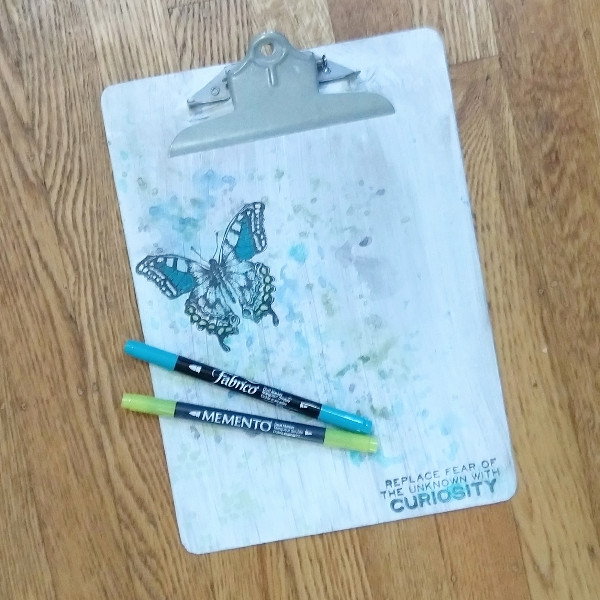 Starting out with Turquoise Gem VersaMagic Chalk Ink, press the ink pad onto a scrap piece of acetate packaging and spray with water. Then press the acetate over the butterfly to create a light blue area around the butterfly. Press the remaining color from the acetate in a diagonal line across the clipboard from the upper left corner to the lower right corner into the stamped sentiment.