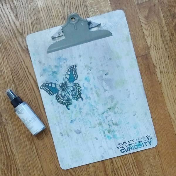 Step 6: Spray Silver Sheer Shimmer Craft Spray onto the acetate and watercolor smoosh it onto the clipboard. Splatter any remaining spray on the acetate onto the clipboard. If larger individual splatters are desired, unscrew the top and use the tube/straw from the spray bottle to dab large blobs of Silver Sheer Shimmer Craft Spray onto the clipboard and finish the project.