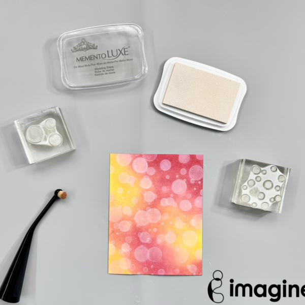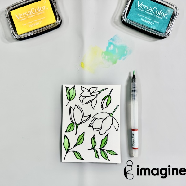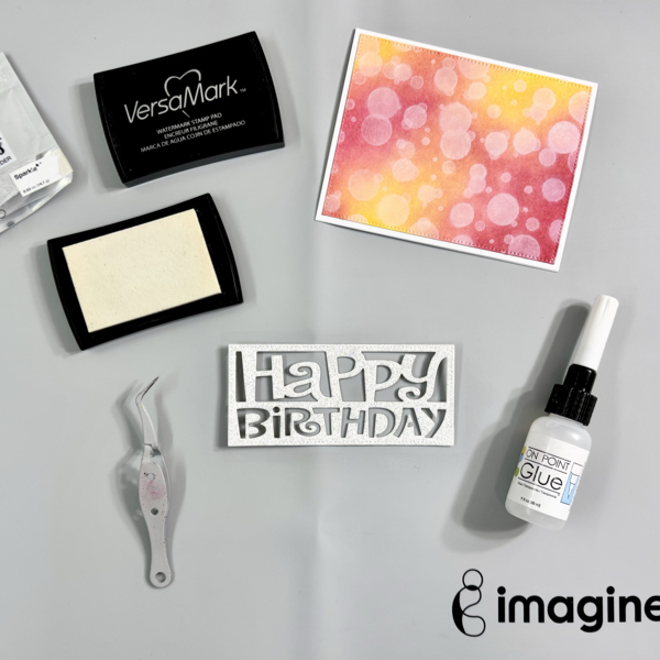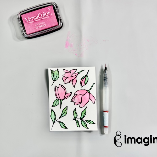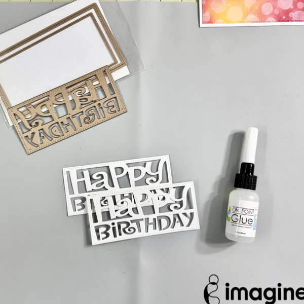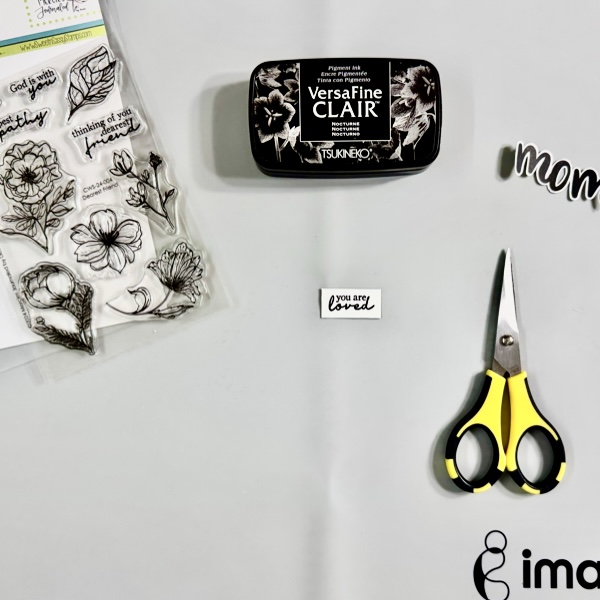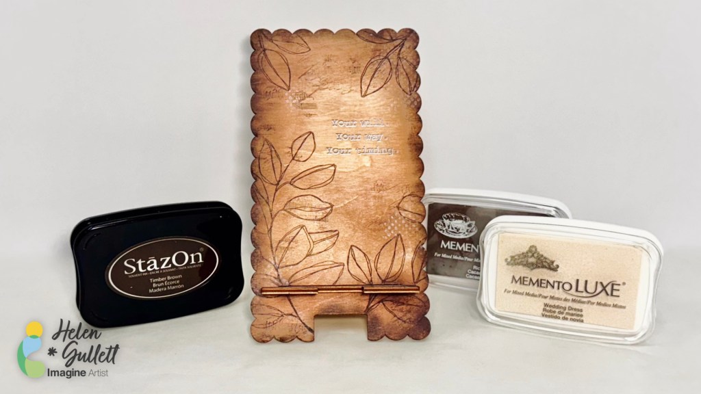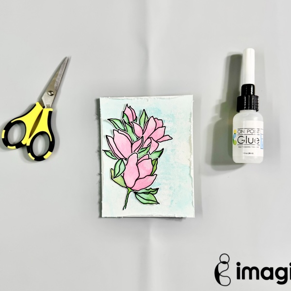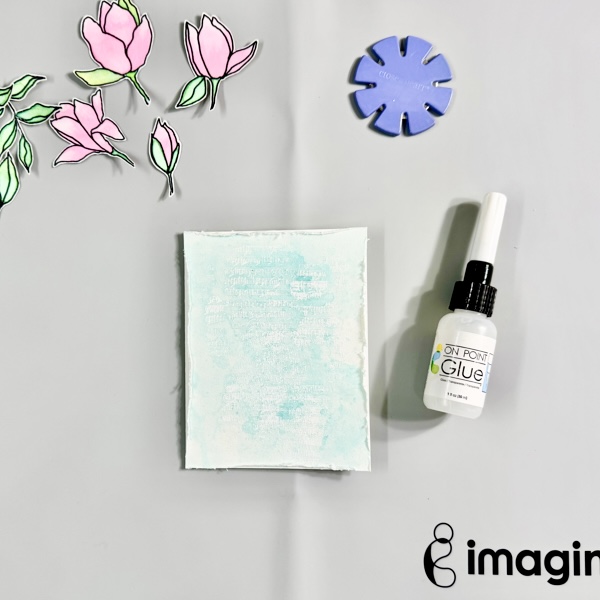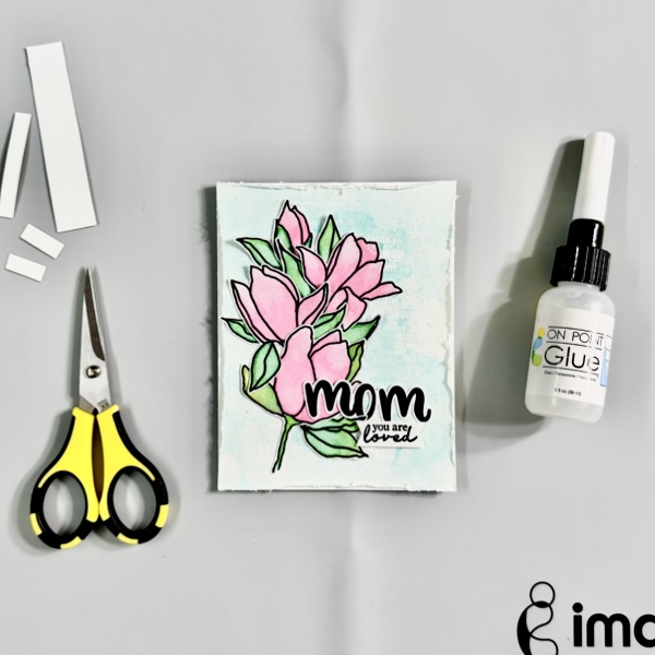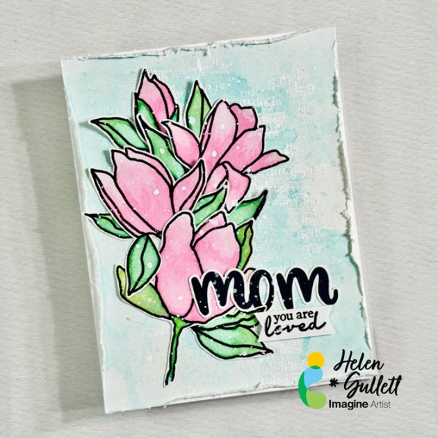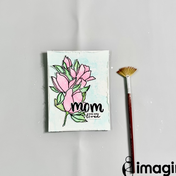 On the dried painted surface, stamp the sentiment using StazON Opaque – Cotton White ink.