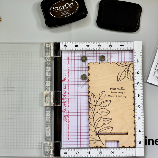 On the wood on a stamping tool and use the magnets to keep it in place or you can use tape on the back of the wood slice and place it on the stamping tool.