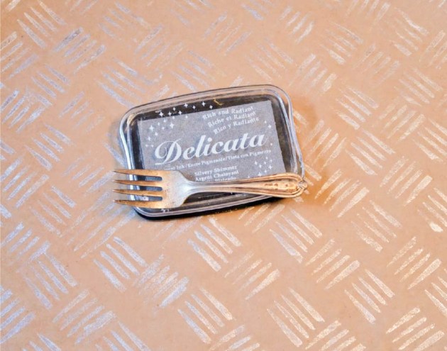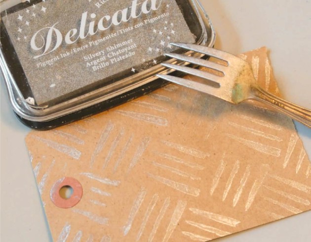 To create the layered look use a fork (I am using a baby fork for the example) to make a cross hatch pattern with Silvery Shimmer Delicata ink.
