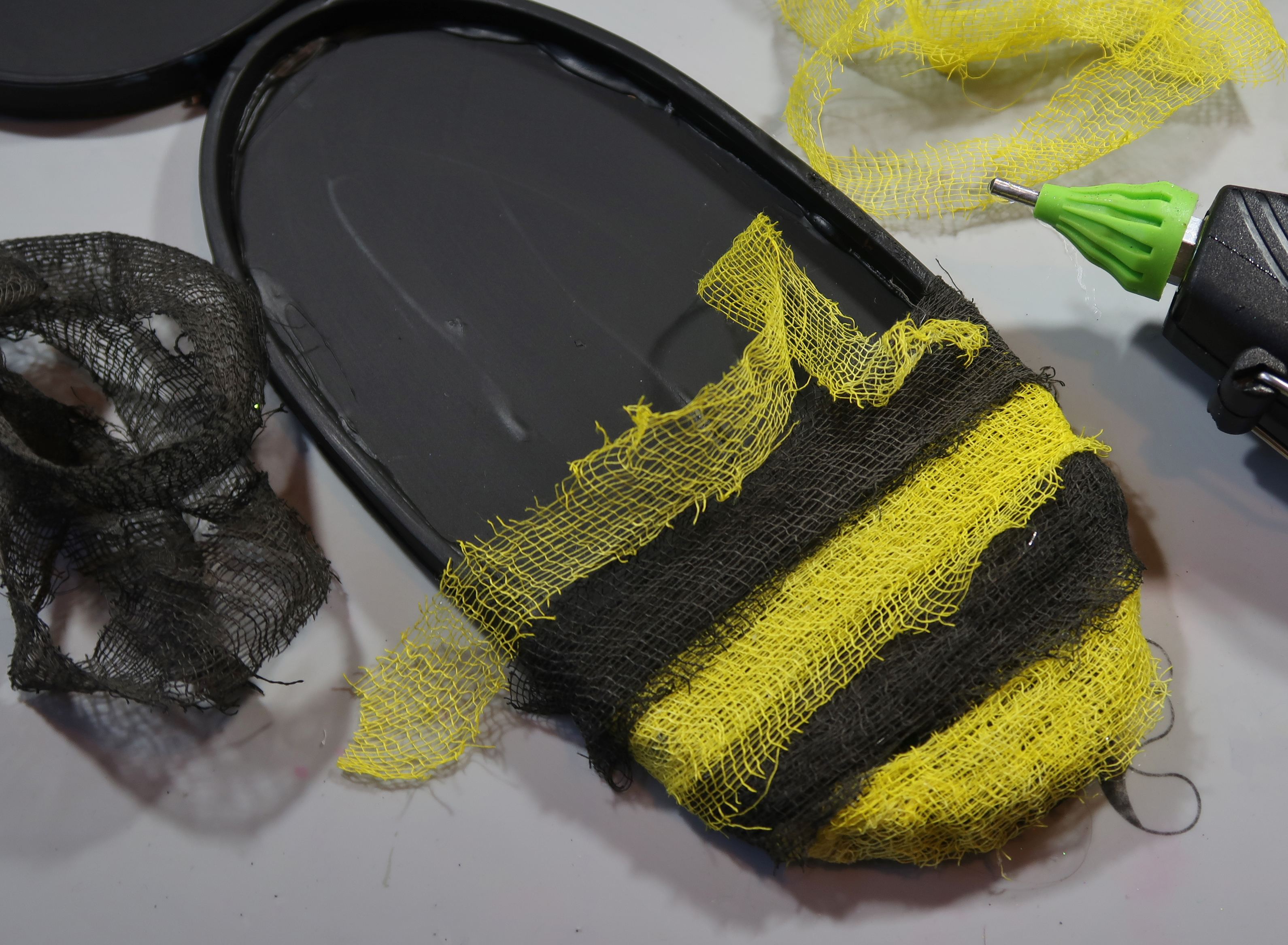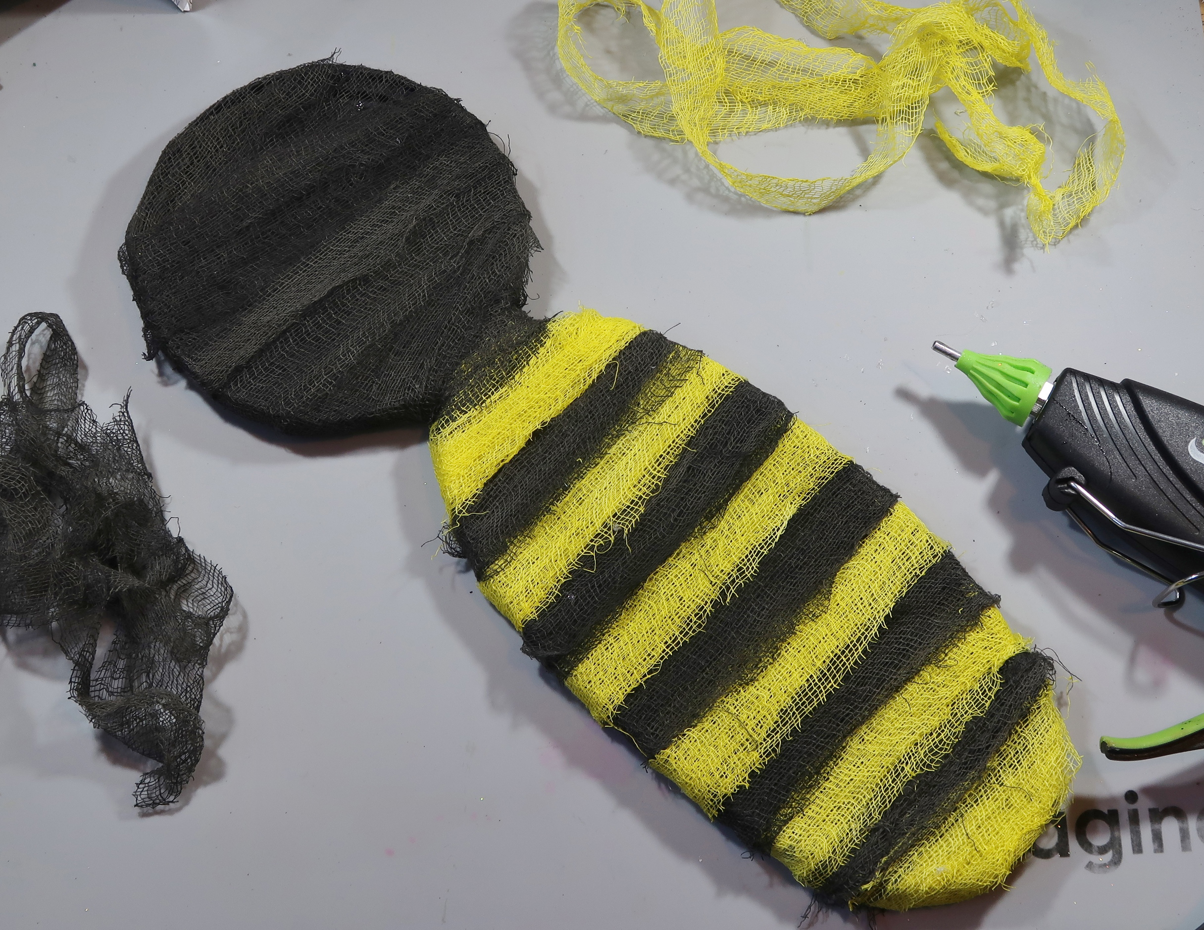 Begin wrapping the body of the bee with the dyed cheesecloth alternating between yellow and black. Wrap the head of the bee with all black cheesecloth. Secure the cheesecloth to the form using hot glue.